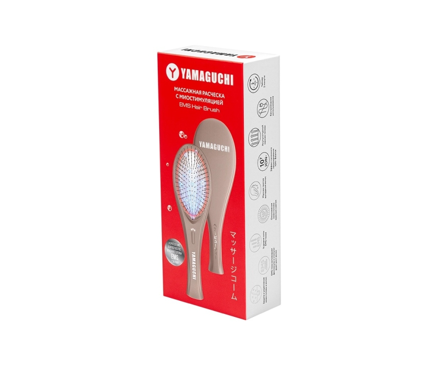 Yamaguchi EMS Hair Brush — многофункциональный прибор для ухода за волосами и кожей головы, работающий сразу в нескольких направлениях. Он помогает в домашних условиях решить проблему восстановления, защиты и укрепления волос, используя для этого популярные средства из области современной трихологии. Высокая эффективность девайса базируется на одновременной работе сразу нескольких технологий: микротоков, EMS, терапии красным светом LED Therapy, ионизации, вибрации и акупунктуры.